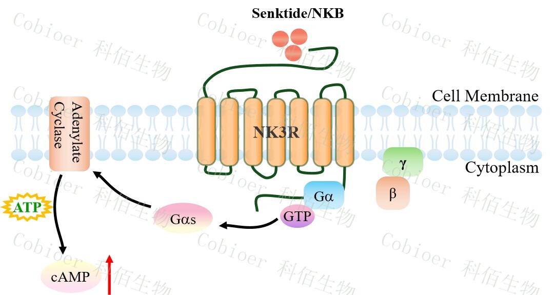 NK3R(Neurokinin 3 Receptor),又稱 TACR3,是速激肽受體家族的重要成員,屬于 GPCR 超家族。其內(nèi)源性配體為神經(jīng)激肽 B(Neurokinin B, NKB),通過激活下游信號通 路參與生殖調(diào)控、神經(jīng)內(nèi)分泌調(diào)節(jié)及多種疾病進程。近年來,NK3R 成為治療更年期癥狀、 神經(jīng)精神疾病及癌癥的熱門靶點。