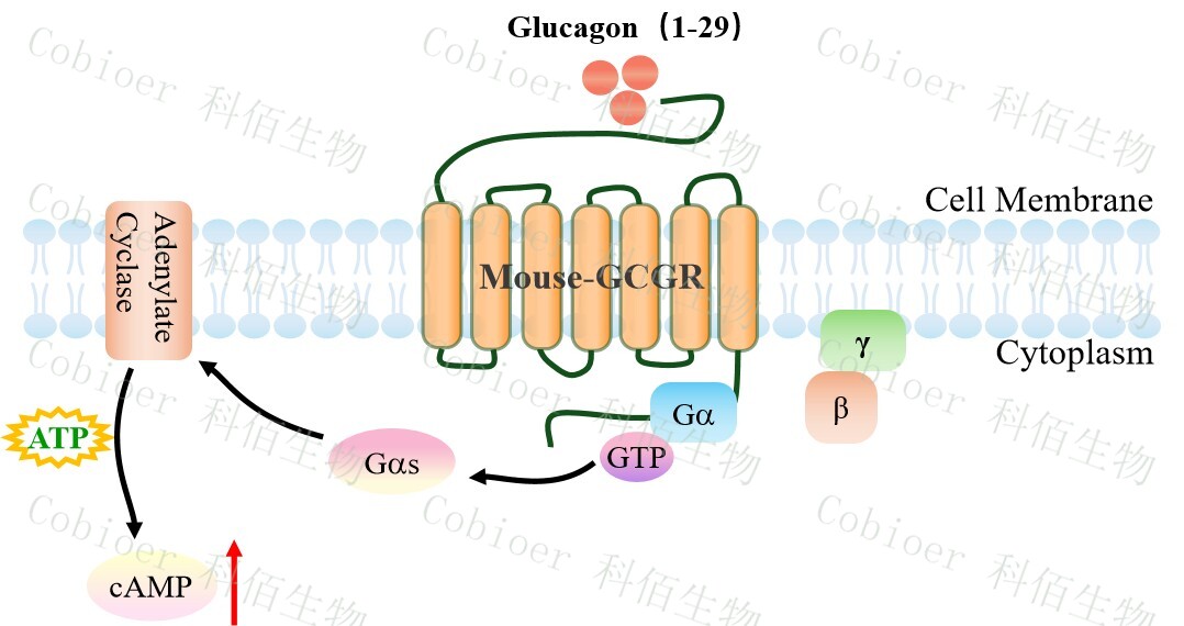 cAMP 在 G 蛋白偶聯(lián)受體(GPCR)信號轉(zhuǎn)導(dǎo)中是一種關(guān)鍵的第二信使。當(dāng)配體結(jié)合到 GPCR,構(gòu)象發(fā)生變化,激活受體接著激活 G 蛋白,Gs 的激活導(dǎo)致腺苷酸環(huán)化酶調(diào)控 cAMP 的升高。Mouse GCGR CHO 藥靶模型很好的模擬了體內(nèi) GCGR 的信號轉(zhuǎn)導(dǎo)過程,原理見下圖所示。![]() Figure 1.Mouse GCGR CHO 細(xì)胞模型原理圖