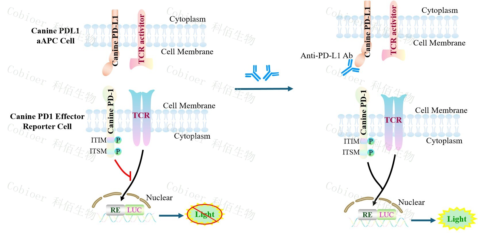 Canine PDL1 aAPC Cell 作為 Canine PD1 Effector Reporter Cell 的靶細(xì)胞,Canine PDL1 aAPC Cell 藥靶模型很好的模擬了體內(nèi) PD1&PDL1 的信號轉(zhuǎn)導(dǎo)過程,原理見下圖所示。![]() Figure 1. Canine PDL1 aAPC Cell 細(xì)胞模型原理圖 |