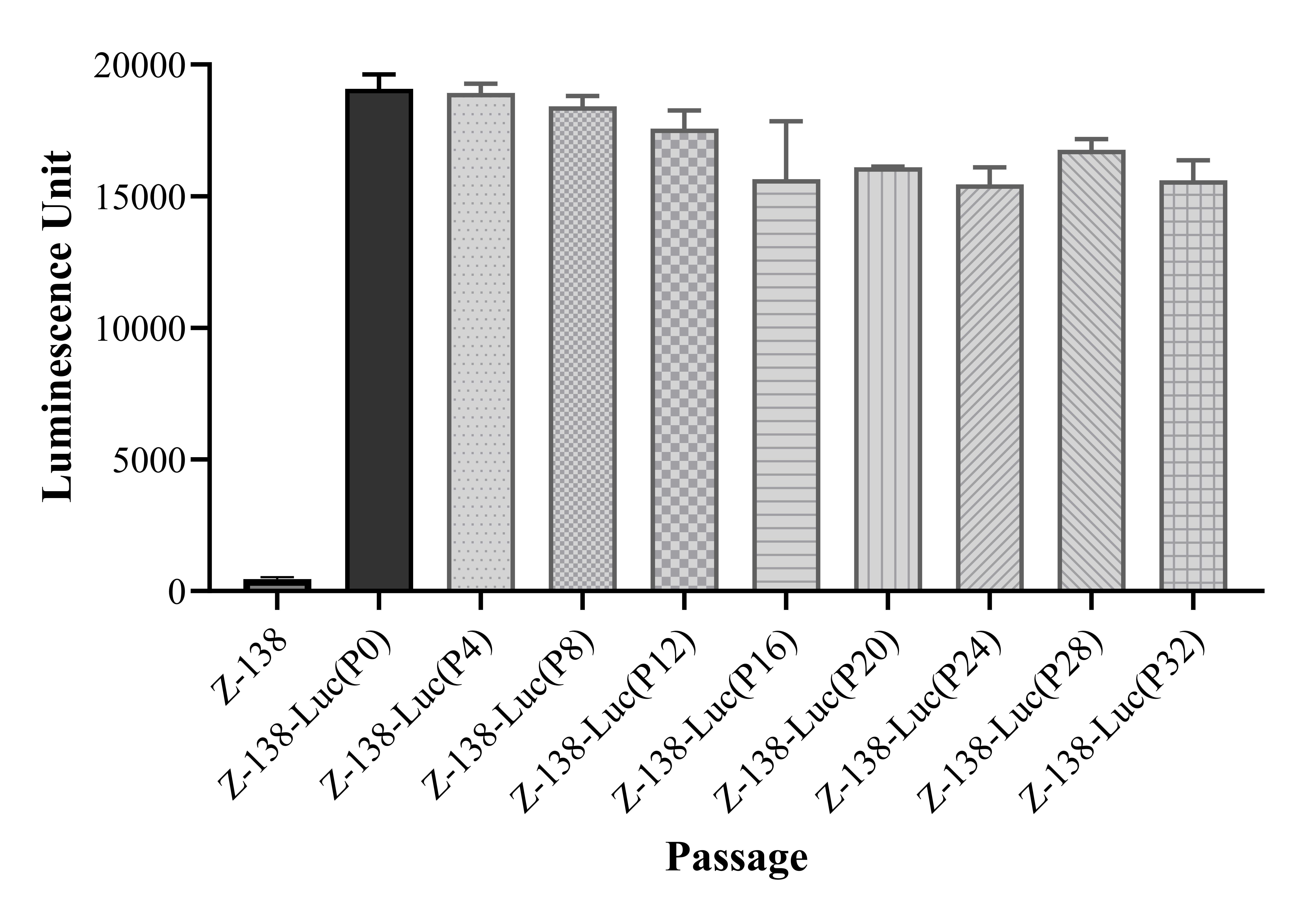 Figure 1. Stablity test results. Z-138-Luc showed at least 32 passage stability with similar luminescence unit.