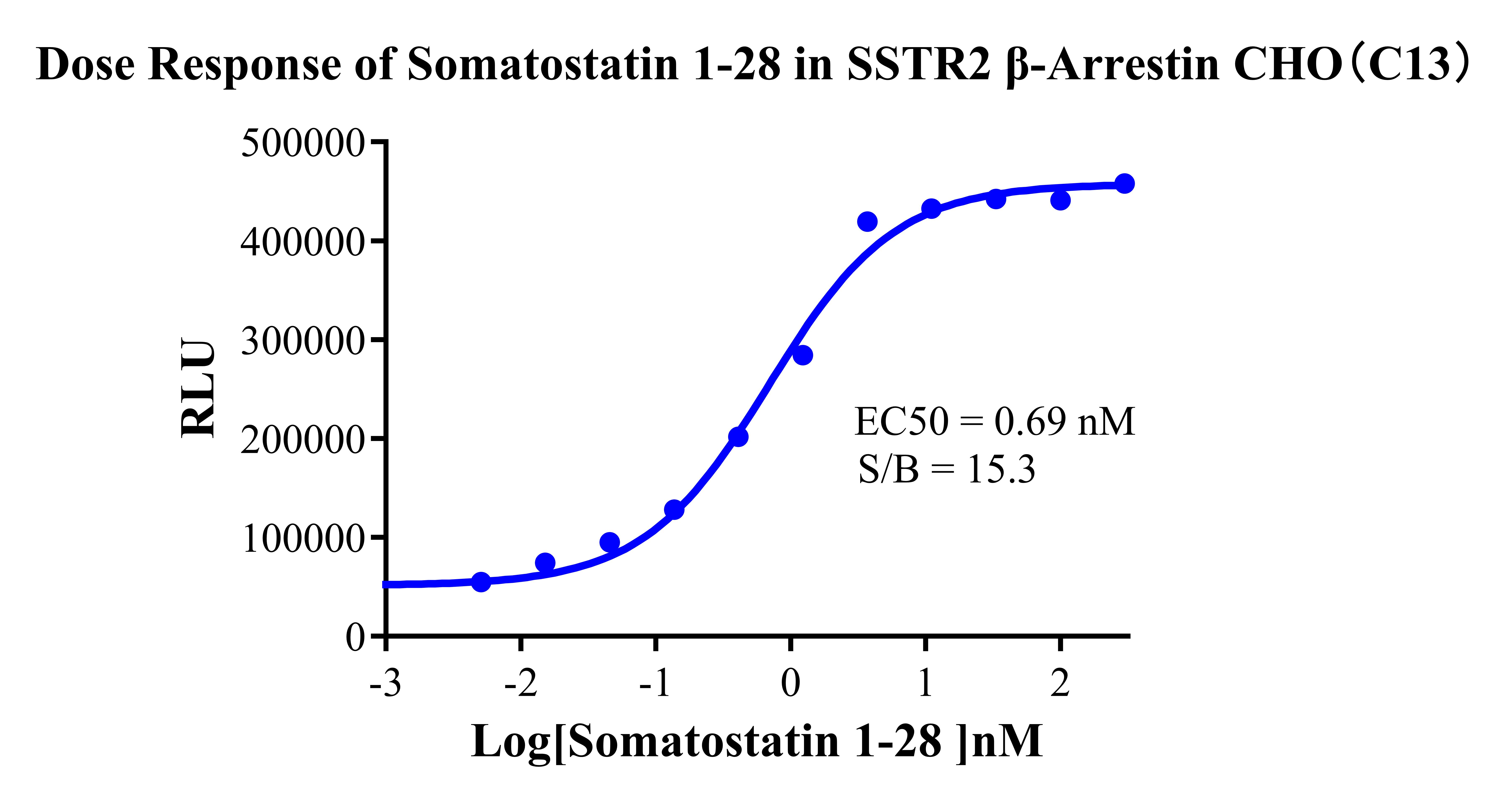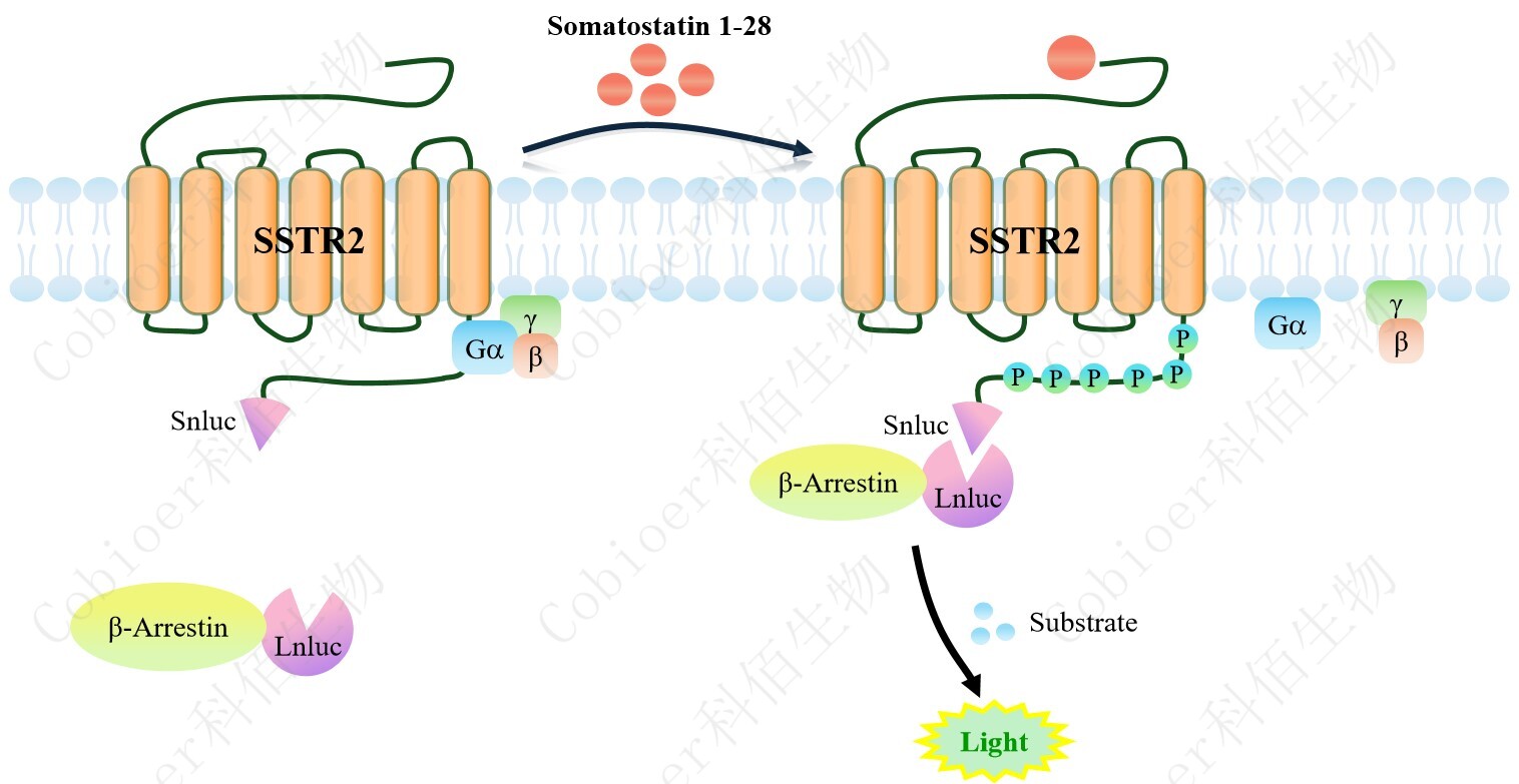 SSTR2 β-Arrestin CHO 報(bào)告基因藥靶模型很好的模擬了體內(nèi) SSTR2/β-Arrestin 的信號(hào) 轉(zhuǎn)導(dǎo)過(guò)程,原理見(jiàn)下圖所示。當(dāng)缺乏配體刺激時(shí),β-Arrestin 不與 SSTR2 結(jié)合,融合β- Arrestin 的熒光素酶處于失活構(gòu)象,當(dāng) SSTR2 遭遇配體刺激時(shí),融合熒光素酶報(bào)告基因的 β-Arrestin 被招募,使熒光素酶報(bào)告基因處于激活狀態(tài),加入其底物后發(fā)光信號(hào)增強(qiáng)。