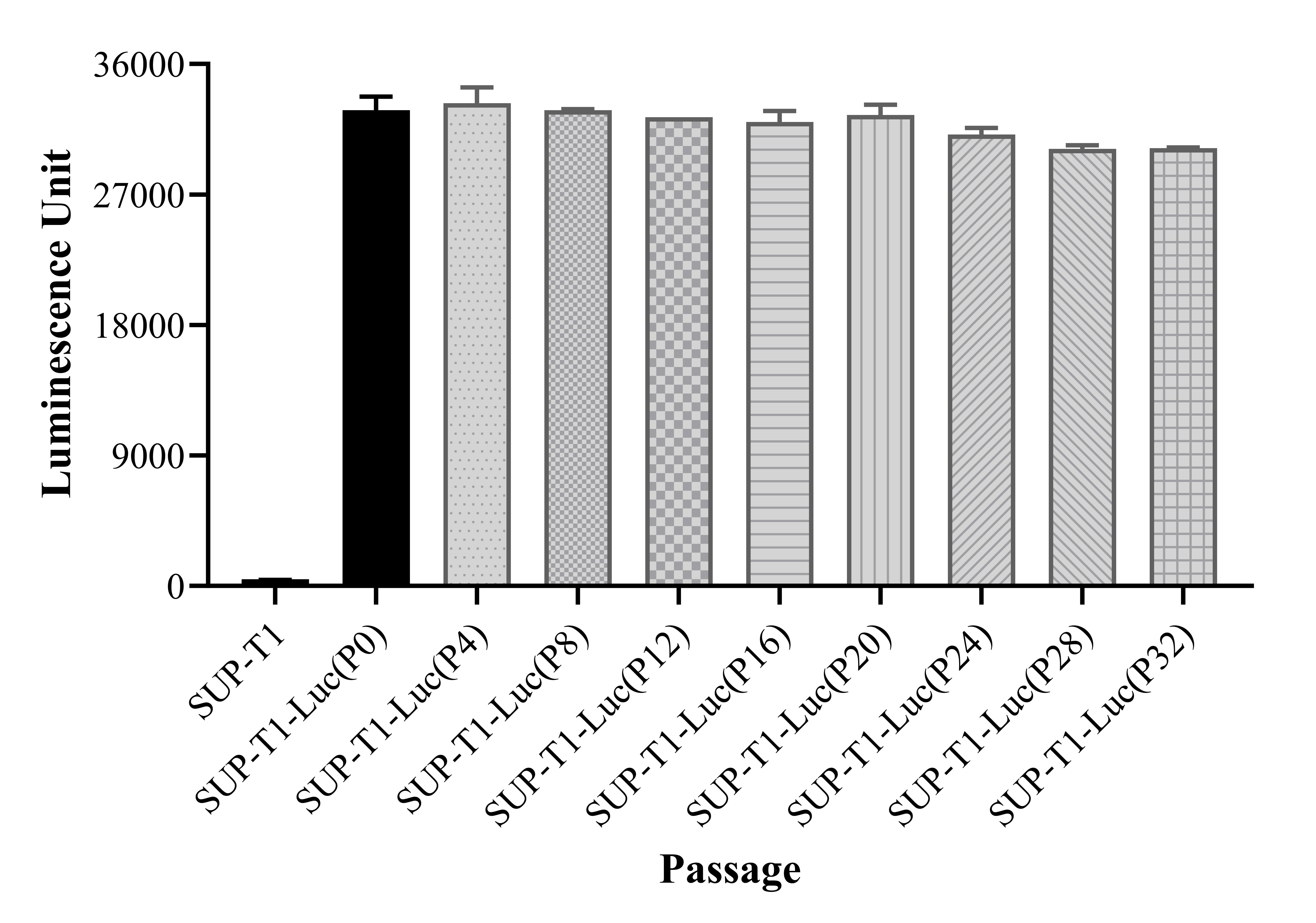Figure 1. Stablity test results. SUP-T1-Luc showed at least 32 passage stability with similar luminescence unit.