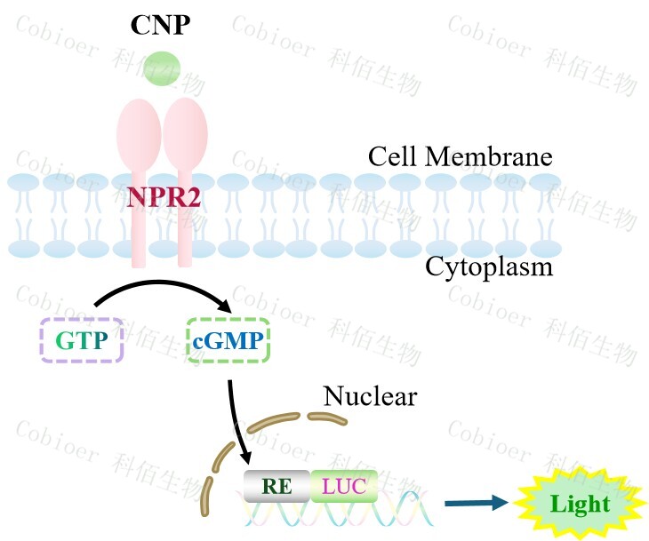NPR2 Effector Reporter Cell 報(bào)告基因藥靶模型很好的模擬了體內(nèi) NPR2 的信號(hào)轉(zhuǎn)導(dǎo)過程,原理見下圖所示。