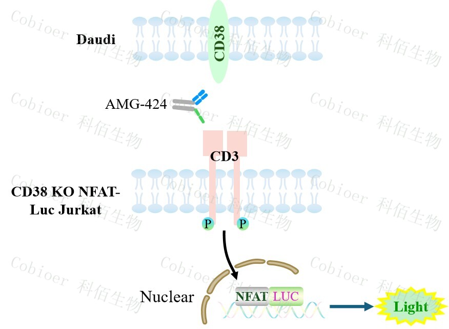 CD38 KO NFAT-Luc Jurkat Cell 報(bào)告基因藥靶模型通過報(bào)告基因的信號(hào)反映 T 細(xì)胞受體 (TCR)信號(hào)通路的激活水平,原理見下圖所示。![]() Figure 1. CD38 KO NFAT-Luc Jurkat Cell 細(xì)胞模型圖 |