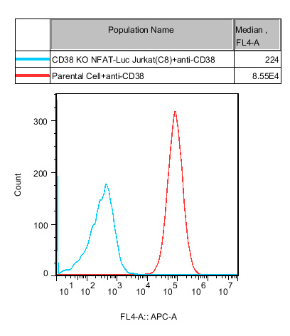 ![]() Figure 2.CD38 KO NFAT-Luc Jurkat Cell,在 NFAT-Luc Jurkat Cell 的基礎(chǔ)上,敲除人的 CD38。 |