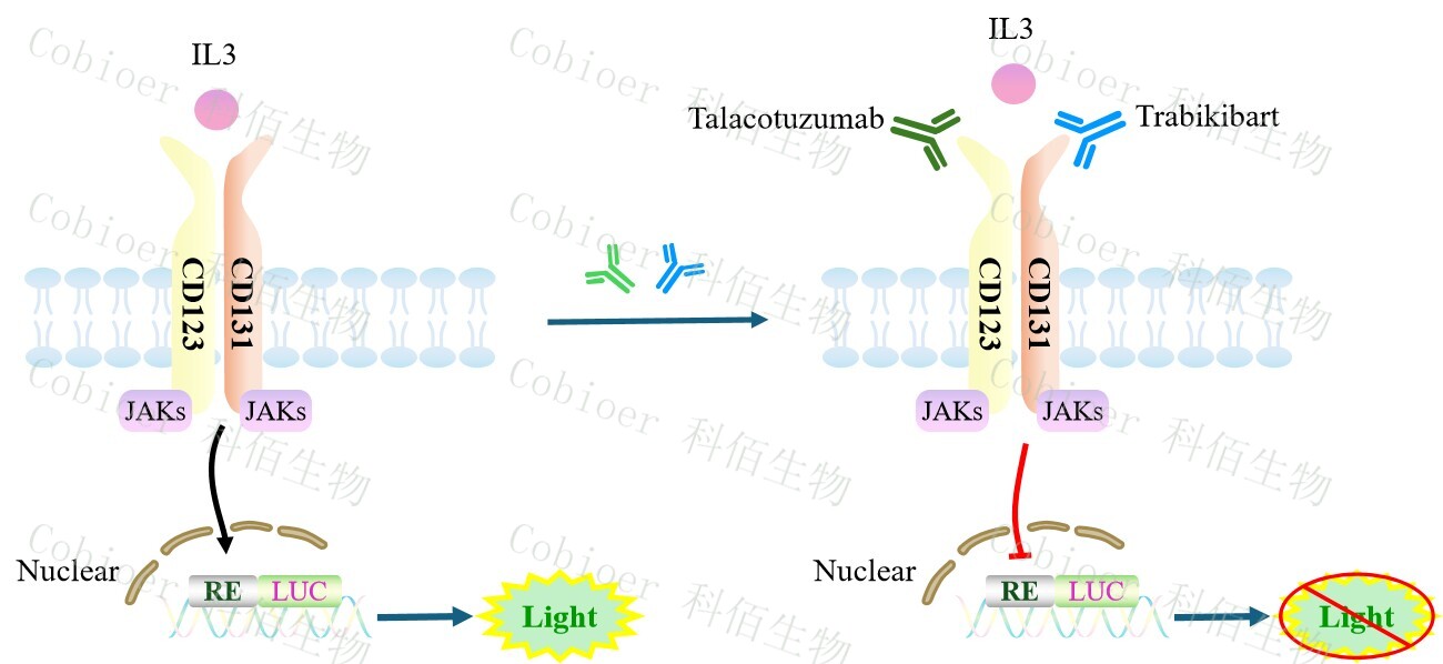IL3 Effector Reporter Cell 報(bào)告基因藥靶模型很好的模擬了體內(nèi) IL3 的信號轉(zhuǎn)導(dǎo)過程,原理見下圖所示。
