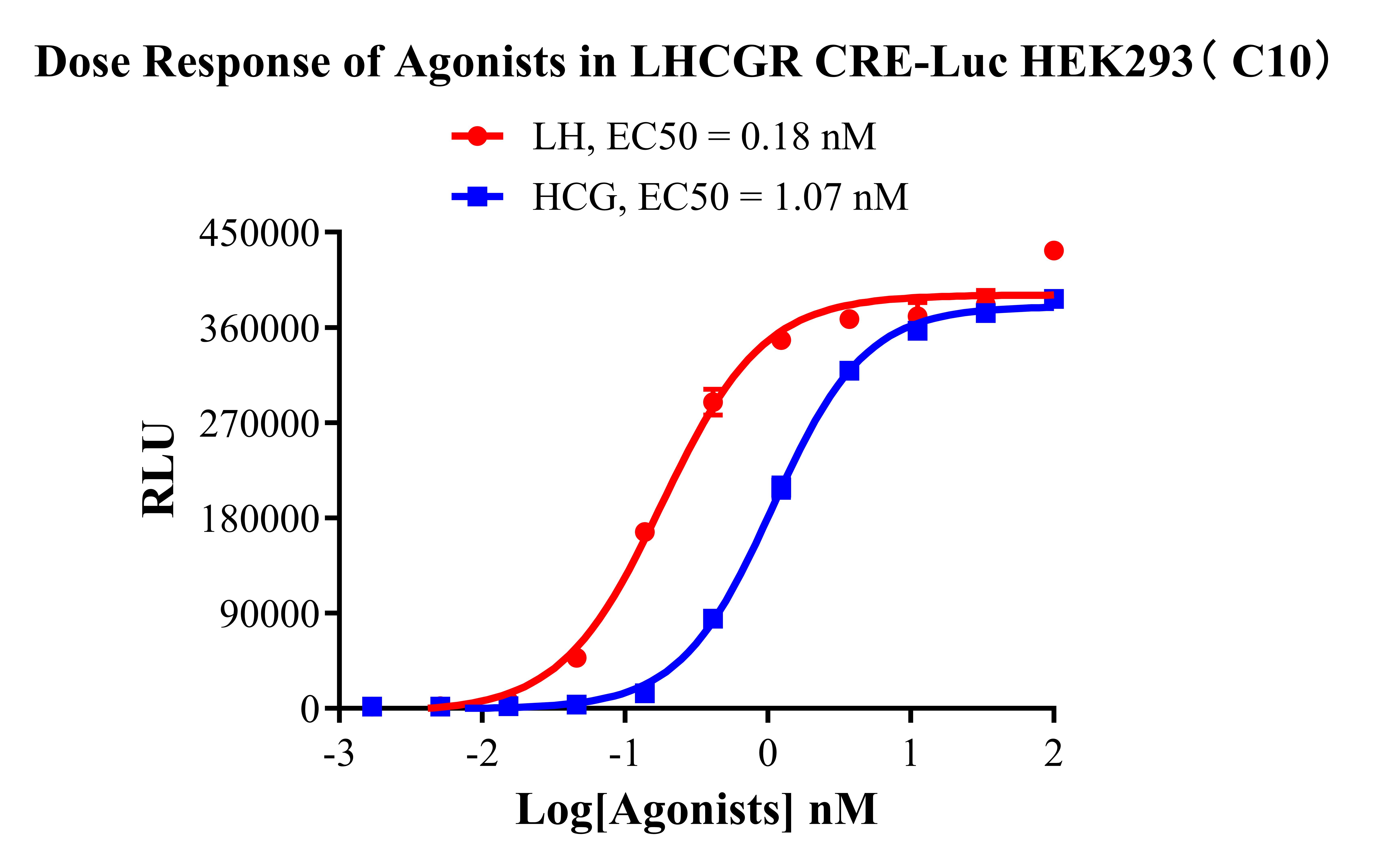 Figure 2. Detect Luciferase assay by Ultra Luciferase Detection Kit CBPH0001(we strongly suggest to purchase from Cobioer). Dose Response of Agonists in LHCGR CRE-Luc HEK293(C10).