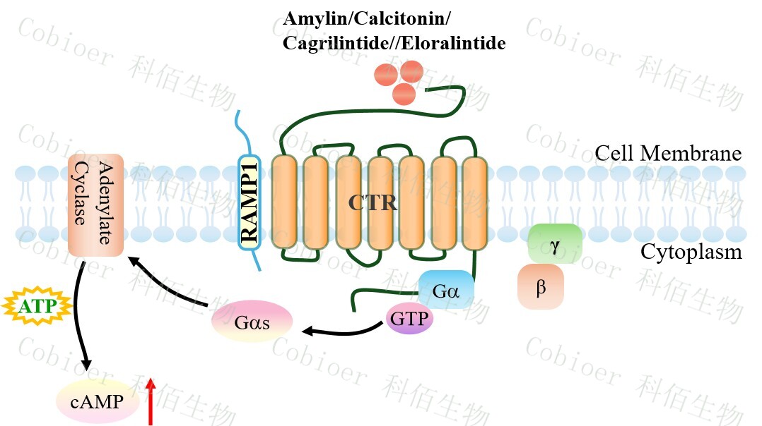 胰淀素(Amylin)受體的三種類型的已被確定,即 AMY1,AMY2 和 AMY3。胰淀素 受體屬于 B 類 GPCR,是異二聚體復(fù)合物,由降鈣素受體(CTR)與受體活性修飾蛋白 (RAMPs)結(jié)合形成。該受體的 CTR 組分具有相同的 GPCR 結(jié)構(gòu):7 個跨膜相互連接的α- 螺旋,將細(xì)胞外信號傳遞到細(xì)胞內(nèi)細(xì)胞質(zhì)信號級聯(lián)。RAMP 有三種類型(RAMP1、 RAMP2 和 RAMP3),它們共享 31%的氨基酸序列,具有相似的基本結(jié)構(gòu)。RAMP 是將 CTR 轉(zhuǎn)運到細(xì)胞膜并調(diào)節(jié)其配體特異性的重要肽,它可以改變特定 GPCR 的藥理學(xué)、功能 和細(xì)胞運輸。