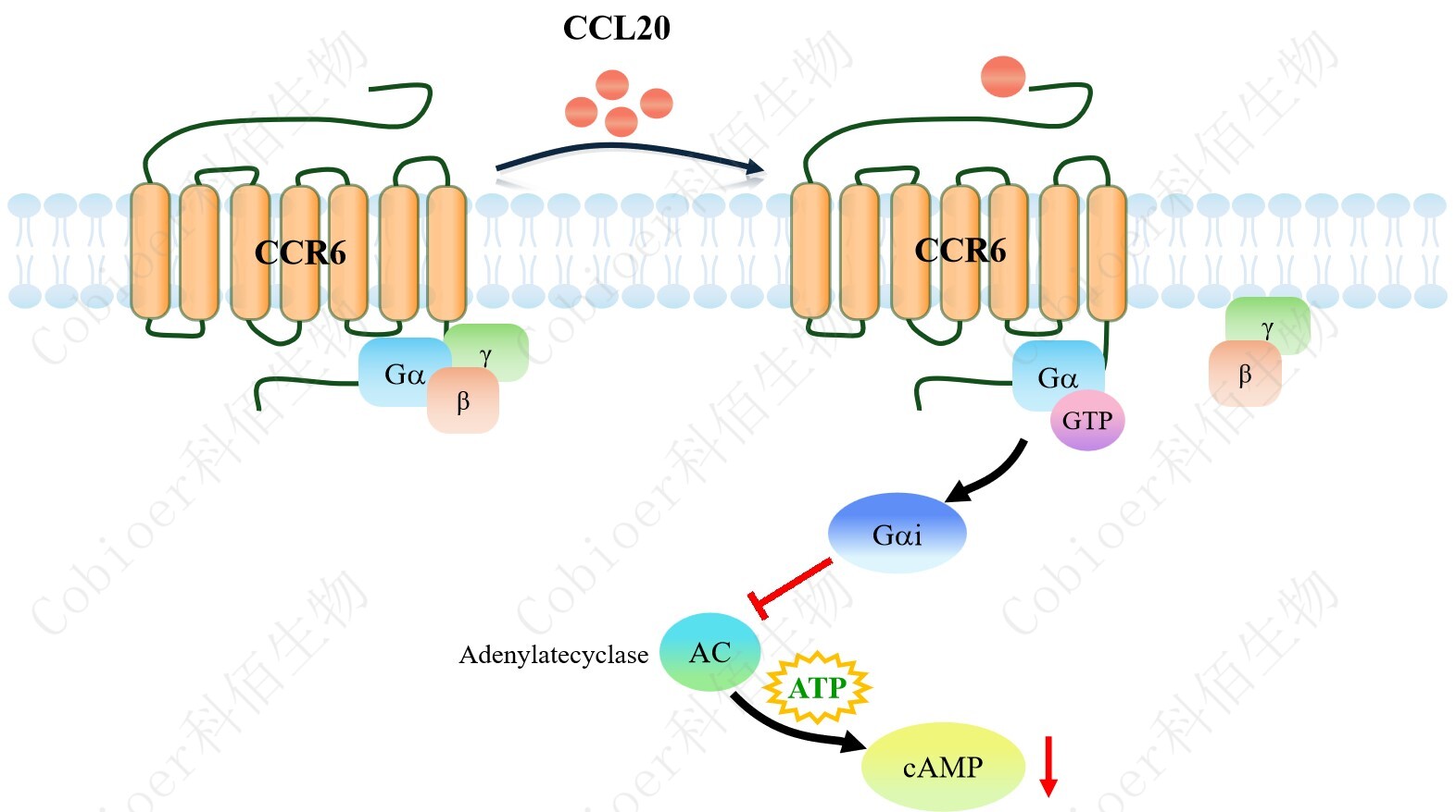 cAMP 在 G 蛋白偶聯(lián)受體(GPCR)信號轉(zhuǎn)導中是一種關(guān)鍵的第二信使。當配體結(jié)合到 GPCR,構(gòu)象發(fā)生變化,激活受體接著激活 G 蛋白,Gi 的激活導致腺苷酸環(huán)化酶調(diào)控 cAMP 的下調(diào)。CCR6 藥靶模型很好的模擬了體內(nèi) CCR6 的信號轉(zhuǎn)導過程,原理見下圖所示。