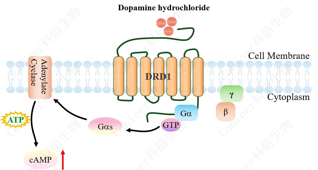 cAMP 在 G 蛋白偶聯(lián)受體(GPCR)信號(hào)轉(zhuǎn)導(dǎo)中是一種關(guān)鍵的第二信使。當(dāng)配體結(jié)合 到 GPCR,構(gòu)象發(fā)生變化,激活受體接著激活 G 蛋白,Gs 的激活導(dǎo)致腺苷酸環(huán)化酶調(diào)控 cAMP 的升高。DRD1 CHO 藥靶模型很好的模擬了體內(nèi) DRD1 的信號(hào)轉(zhuǎn)導(dǎo)過(guò)程,原理見(jiàn)下圖所示。