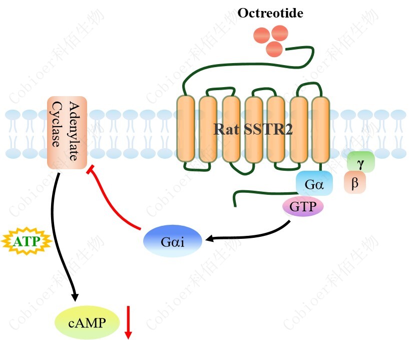 cAMP 在 G 蛋白偶聯(lián)受體(GPCR)信號轉(zhuǎn)導(dǎo)中是一種關(guān)鍵的第二信使。當配體結(jié)合 到 GPCR,構(gòu)象發(fā)生變化,激活受體接著激活 G 蛋白,Gi 的激活導(dǎo)致腺苷酸環(huán)化酶調(diào)控 cAMP 的下調(diào)。Rat SSTR2 CHO 藥靶模型很好的模擬了體內(nèi) SSTR2 的信號轉(zhuǎn)導(dǎo)過程,原理 見下圖所示。