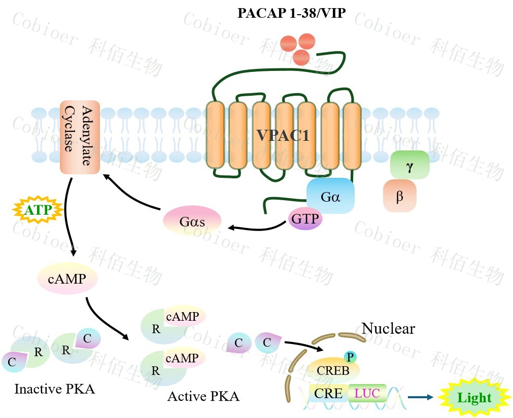 VPAC1 CRE-Luc HEK293 報(bào)告基因藥靶模型很好的模擬了體內(nèi) VPAC1 的信號(hào)轉(zhuǎn)導(dǎo)過程,原理見下圖所示。