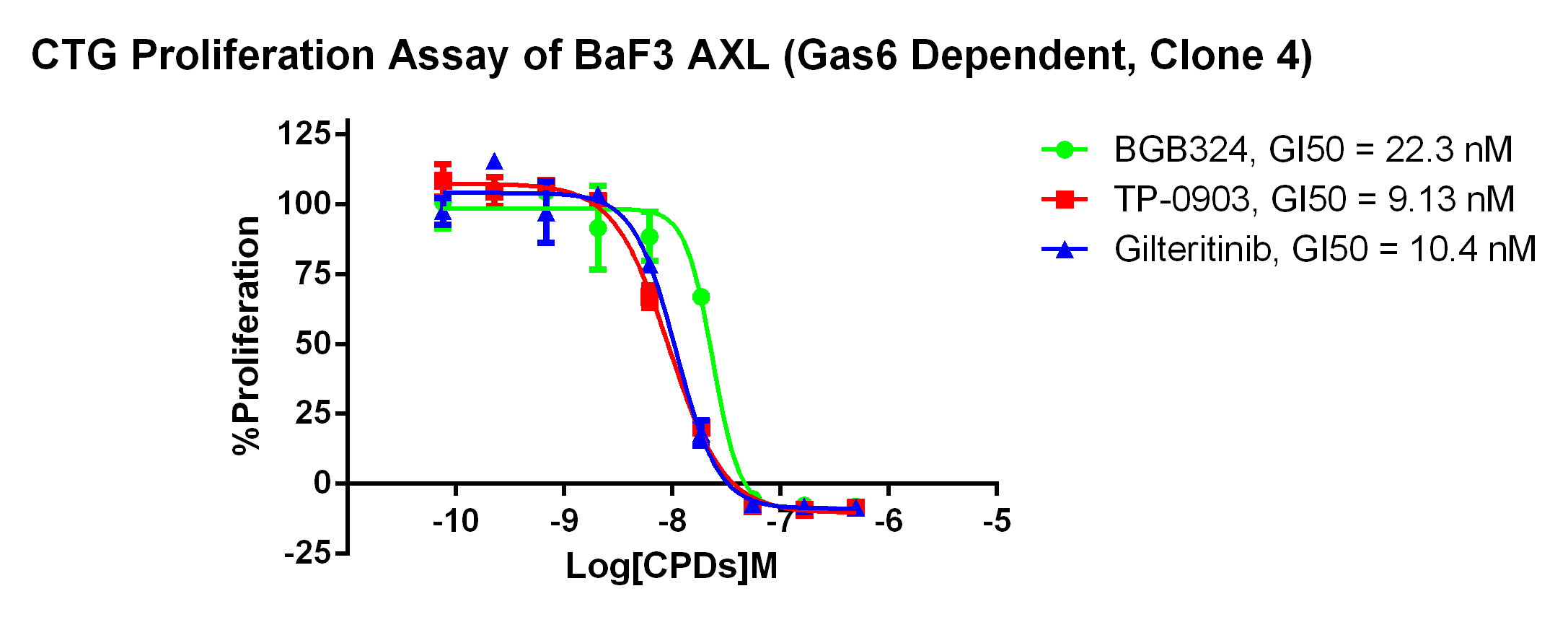 Figure . Anti-proliferation assay of three reference compounds on the AXL (Gas6 Dependent)/BaF3 Stable Cell Line.