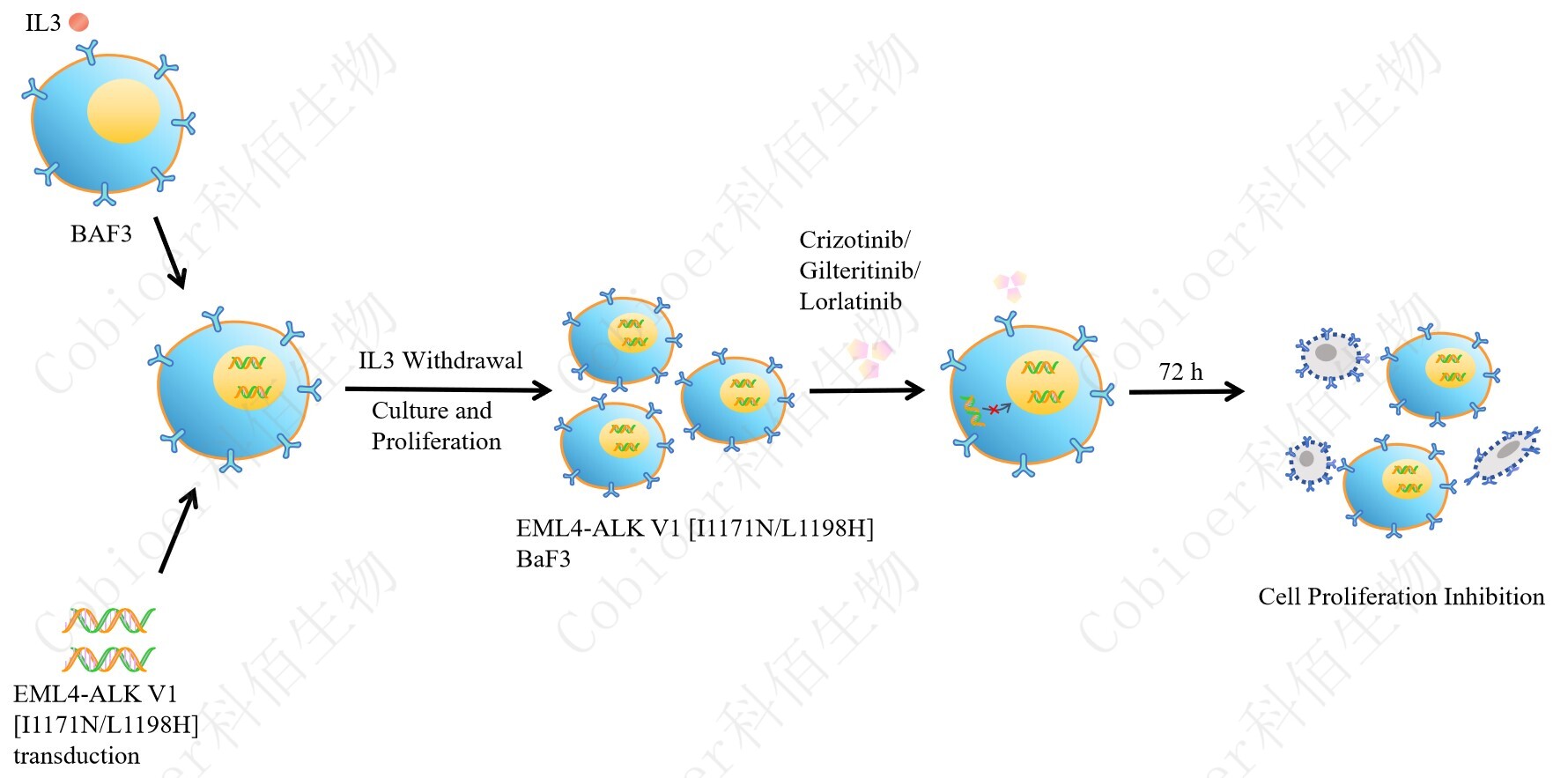 Figure 1. EML4-ALK V1 [I1171N/L1198H]/BaF3 細(xì)胞的構(gòu)建原理圖