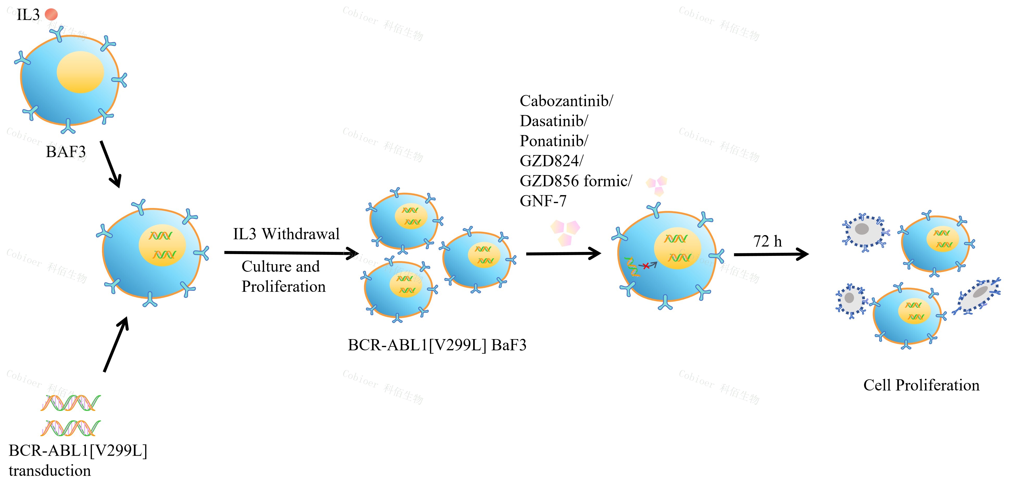 BCR-ABL1[V299L] BaF3 藥靶細(xì)胞 , 通過轉(zhuǎn)導(dǎo)突變狀態(tài)的 BCR- ABL1[V299L]基因到 BaF3 細(xì)胞系中,穩(wěn)定表達(dá)人突變形態(tài)下的 BCR-ABL1[V299L]基因。