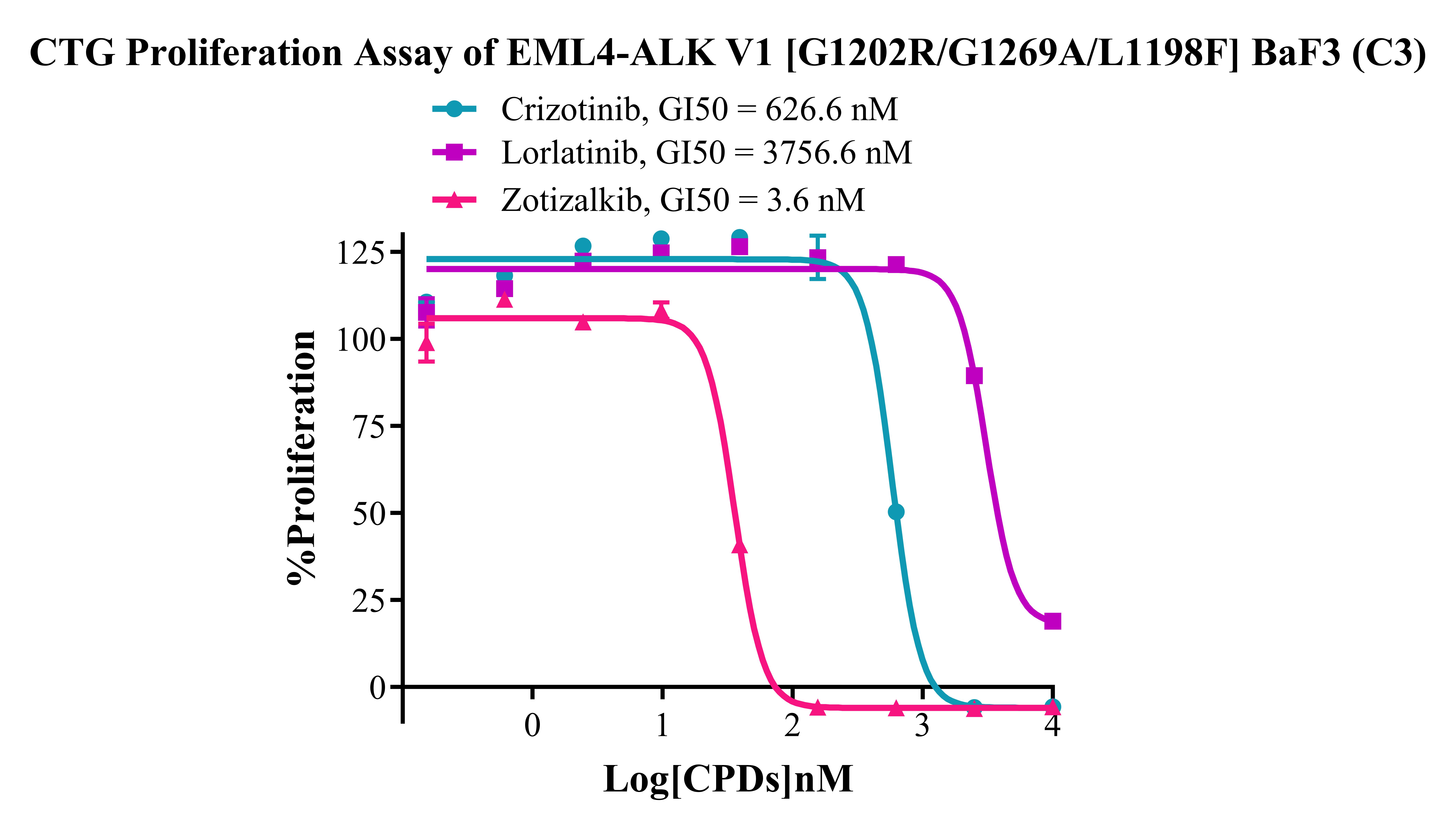 Figure 5. CTG Proliferation Assay of EML4-ALK V1 [G1202R/G1269A/L1198F]  BaF3(C3).