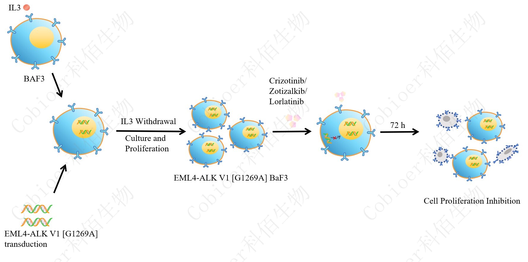 BaF3(小鼠原 B 細胞)的生長和增殖需要 IL-3 的維持。通過引入各種表達激酶的基因, 能作為 BaF3 的驅(qū)動基因,讓 BaF3 不再依賴 IL-3 而增殖,進而激酶基因成為 BaF3 增殖依 賴的驅(qū)動基因,用于評估小分子藥物對激酶的靶向抑制作用,原理及流程見下圖所示。