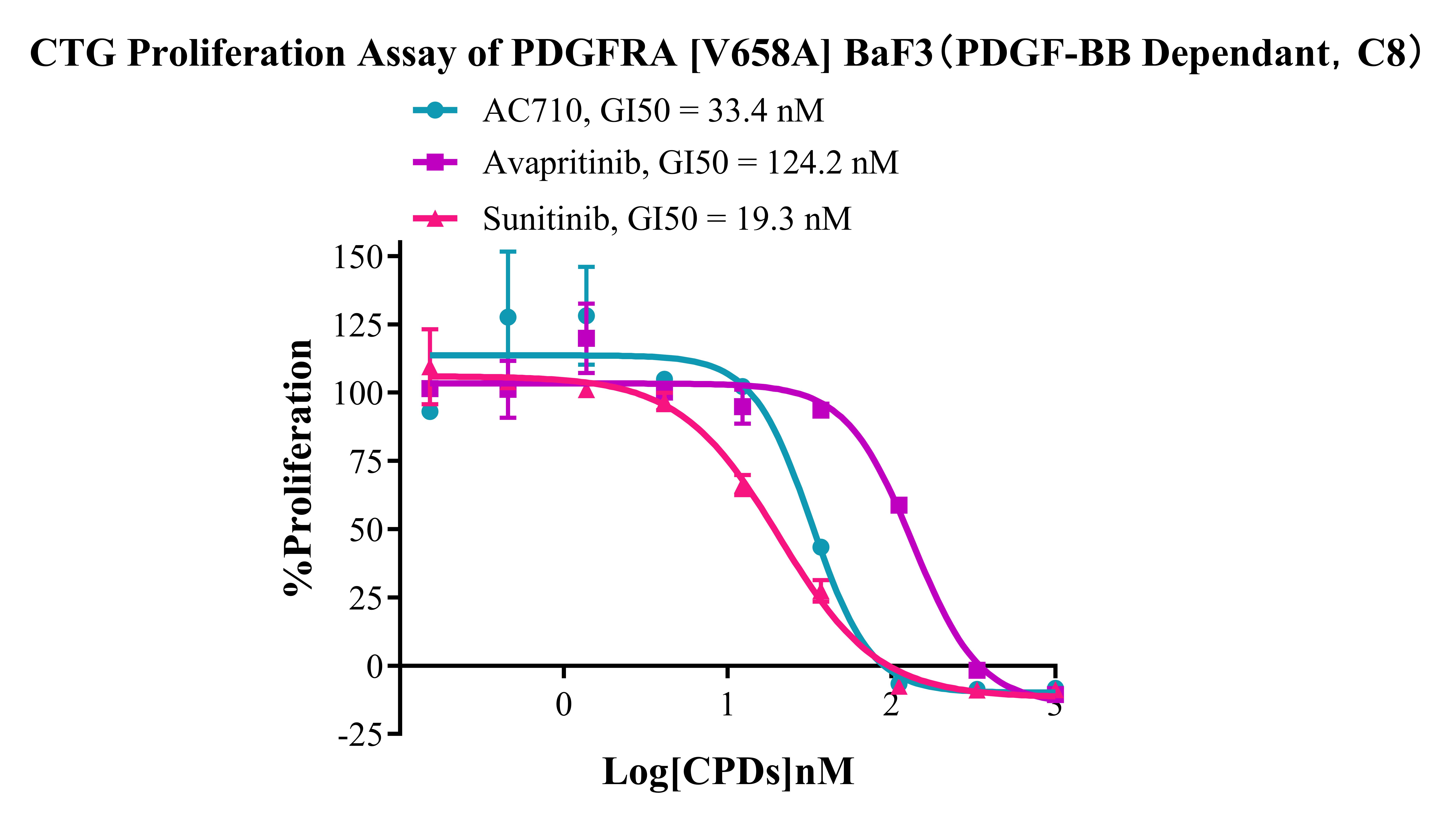 Figure 4. CTG Proliferation Assay of PDGFRA [V658A] BaF3 (PDGF-BB Dependant, C8).