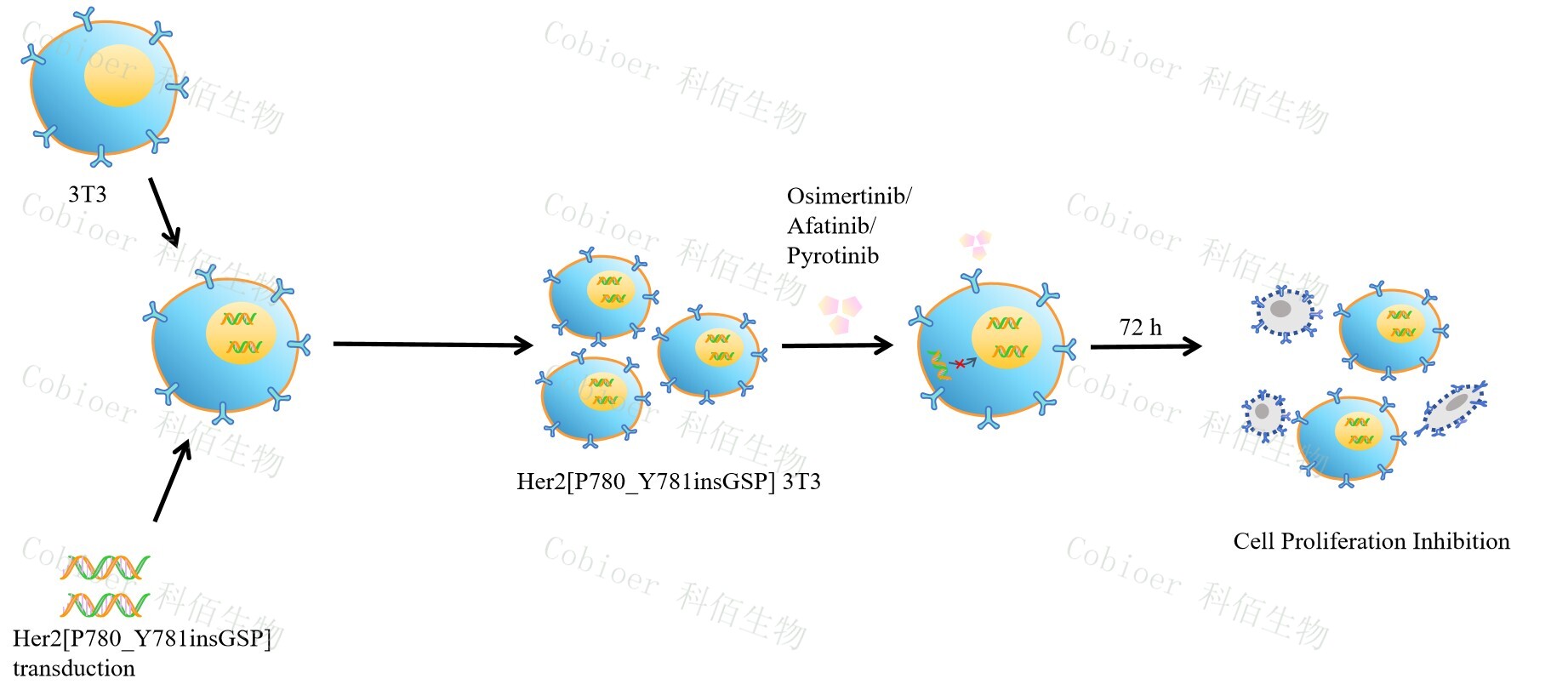 HER2[P780_Y781insGSP] 3T3 藥靶細(xì)胞 , 通過轉(zhuǎn)導(dǎo)突變狀態(tài)的 HER2[P780_Y781insGSP] 基因到 3T3 細(xì)胞系中 , 穩(wěn)定表達(dá)人突變形態(tài)下的 HER2[P780_Y781insGSP]基因,原理及流程見下圖所示。![]() Figure 1. HER2[P780_Y781insGSP] 3T3 細(xì)胞的構(gòu)建原理圖 |