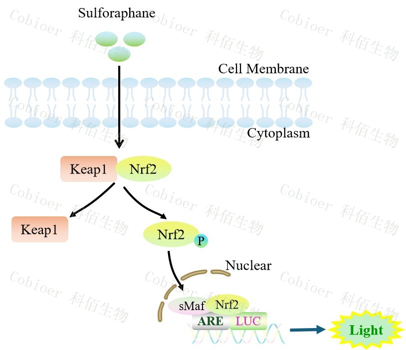 ARE-Luc(Nrf2 Antioxidant Pathway) HEK293 報告基因細胞,是由 ARE 調(diào)控并表達 Luc 熒光素酶報告基因的 HEK293 細胞。Sulforaphane 是 Keap1/Nrf2/ARE 的誘 導(dǎo)劑,原理見下圖所示。