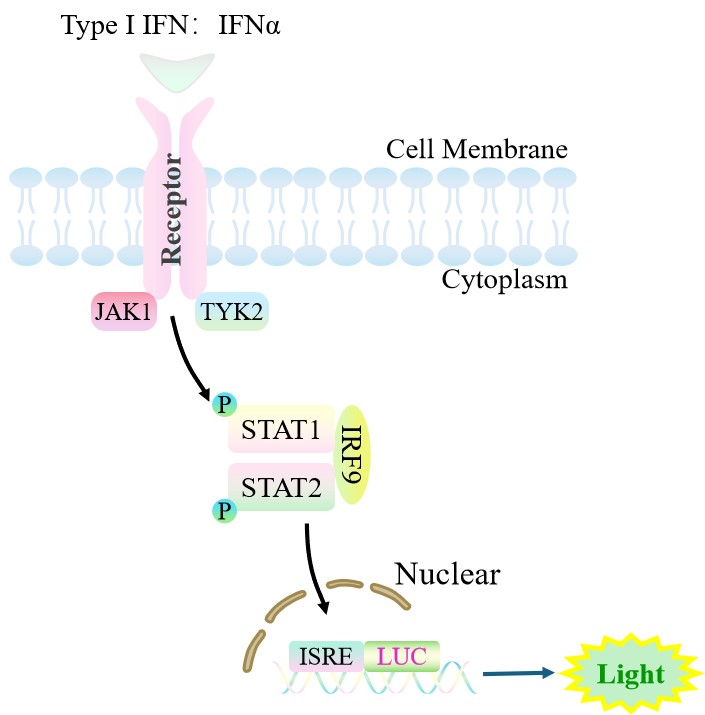 ISRE-Luc HEK293 報告基因細胞是由 ISRE 調控并表達 Luc 熒光素酶報告基因的 HEK293 細胞。IFN 與受體結合,激活 ISRE 的原理見下圖所示。