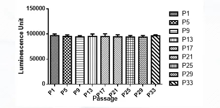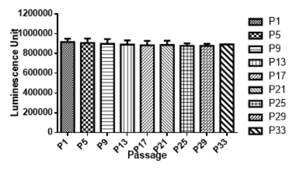 4. 示蹤細胞體外發(fā)光測試,測定發(fā)光信號強度和細胞傳代信號穩(wěn)定性,確保示蹤細胞在體外和體內(nèi)都能穩(wěn)定高水平表達標記蛋白,以科佰生物A549-Luc細胞為例: