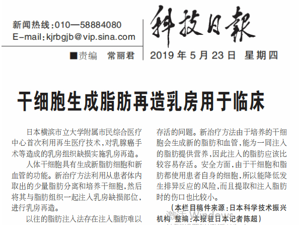 日本橫濱市立大學(xué)附屬市民綜合醫(yī)療中心首次利用再生醫(yī)療技術(shù),對(duì)乳腺癌手術(shù)等造成的乳房組織缺損實(shí)施乳房再造。人體干細(xì)胞具有生…