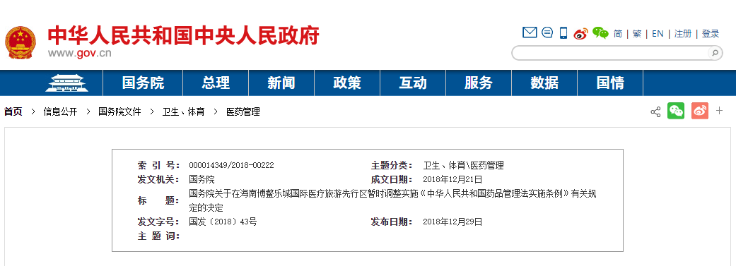 近日,國務院發(fā)布《關于在海南博鰲樂城國際醫(yī)療旅游先行區(qū)暫時調(diào)整實施<中華人民共和國藥品管理法實施條例>有關規(guī)定的決定》。國務院決定,在海南博鰲樂城國際醫(yī)療旅游先行區(qū)暫時調(diào)整實施《中華人民共和國藥品管理法實施條例》第三十六條的規(guī)定,對先行…