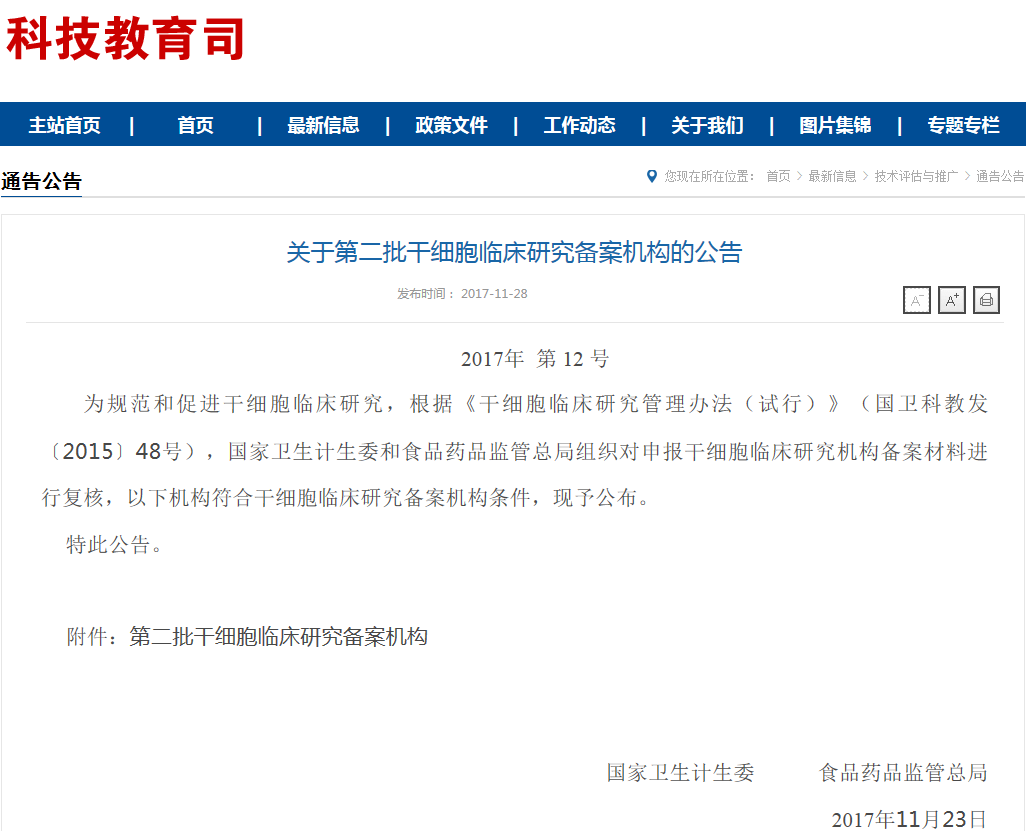 截止至2017年11月28日,我國一共有102家醫(yī)院(干細胞臨床研究機構)通過備案。附件: