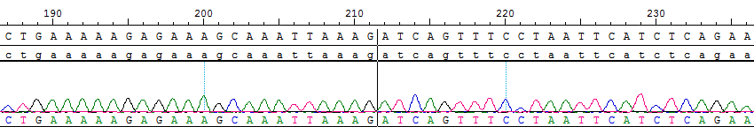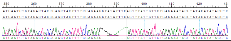 Fig 2. RNA的sanger測(cè)序發(fā)生14外顯子的缺失