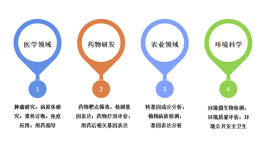 實時熒光定量PCR具有靈敏度高、特異性強、快速高效的特點,廣泛應用于生物醫(yī)藥、臨床診斷、農(nóng)業(yè)、環(huán)境科學等多個領域,常用于檢測基因表達、基因變異、轉(zhuǎn)基因等。