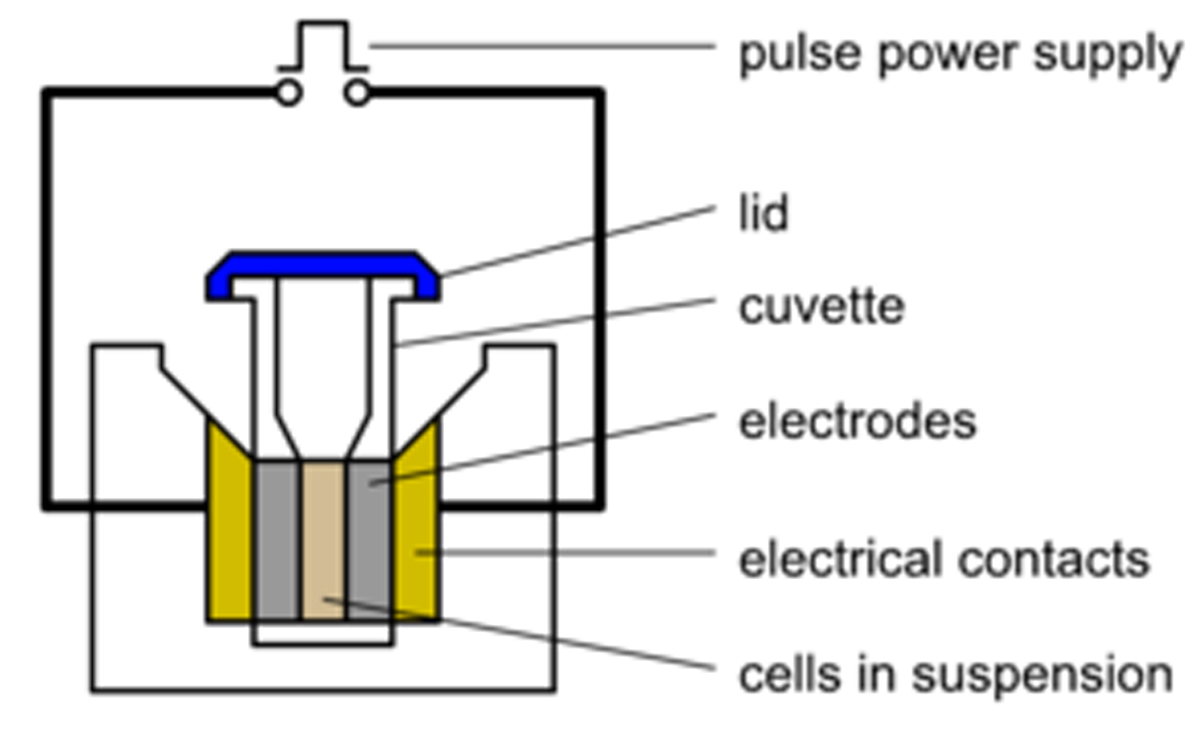 體外電穿孔時,將靶細(xì)胞懸浮液與待導(dǎo)入細(xì)胞的質(zhì)粒DNA在導(dǎo)電溶液中混合,然后放入比色皿中(圖1)。電穿孔比色皿的樣品室兩側(cè)各有一塊金屬板,電流可以通過混合物。將比色皿放入電穿孔儀的腔室中,該腔室配有相應(yīng)的電觸點,使比色皿形成電路。電穿孔儀上的控制器允許用戶設(shè)置待輸送電脈沖的電壓、波形和持續(xù)時間,這些參數(shù)應(yīng)根據(jù)靶細(xì)胞類型進行優(yōu)化。然后,電脈沖通過樣品室。