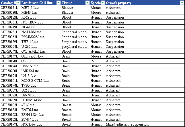 表7. 科佰生物部分現(xiàn)貨示蹤Luc細胞的清單展示