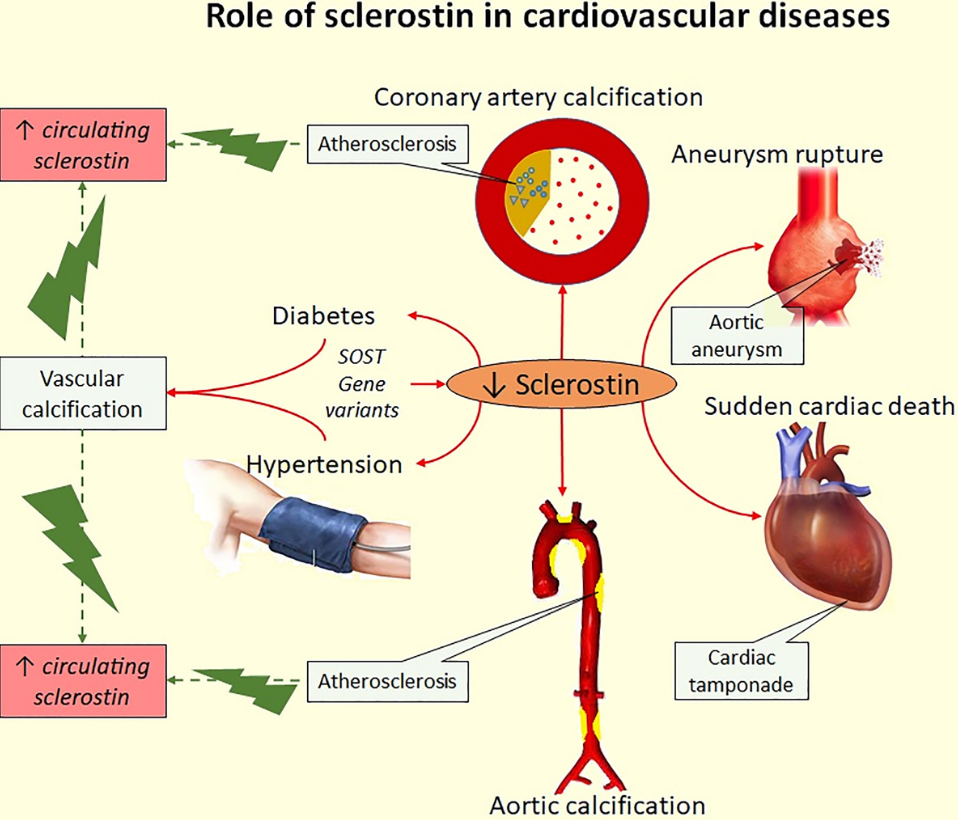 硬化蛋白在廣泛分布于心血管系統(tǒng)的VSMC (vascular smooth muscle cell, VSMC)中表達(dá),并與許多血管疾病有關(guān)。動(dòng)物研究表明,在腹主動(dòng)脈瘤AAA、動(dòng)脈粥樣硬化和心臟破裂中存在硬化蛋白缺乏,并發(fā)現(xiàn)其在動(dòng)脈鈣化部位上調(diào)。有報(bào)告指出,導(dǎo)致動(dòng)脈硬化蛋白表達(dá)降低的基因變異增加了高血壓和糖尿病的患病率,并提高了心血管事件的風(fēng)險(xiǎn)。