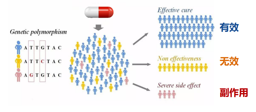 圖1:基因多態(tài)性導(dǎo)致藥物的個(gè)體化差異(相同病癥、相同藥物、相同劑量、不同藥效)