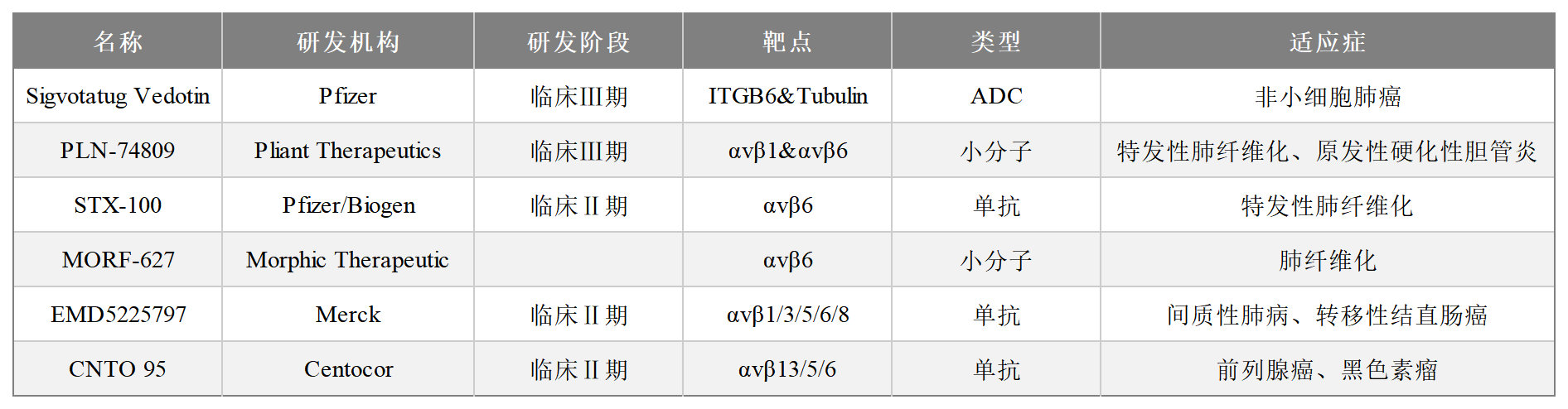 2025年JPM大會上,Pfizer 公布其Sigvotatug Vedotin(SGN-B6A)在非小細(xì)胞肺癌患者中良好的抗腫瘤活性和初步的療效,特別是在未接受過紫杉烷治療的非鱗狀NSCLC患者中,其療效更為顯著。整合素αvβ6作為纖維化和腫瘤治療的潛力靶點,近年來藥物研發(fā)進展迅速,涵蓋單抗、小分子、ADC及基因療法等領(lǐng)域。