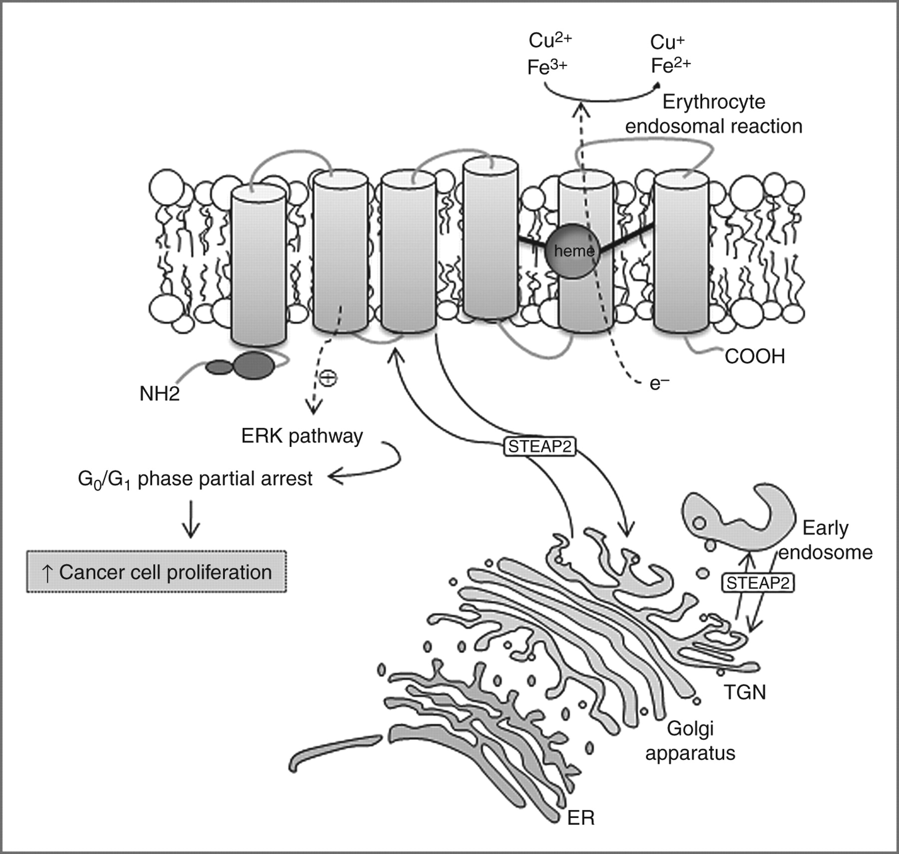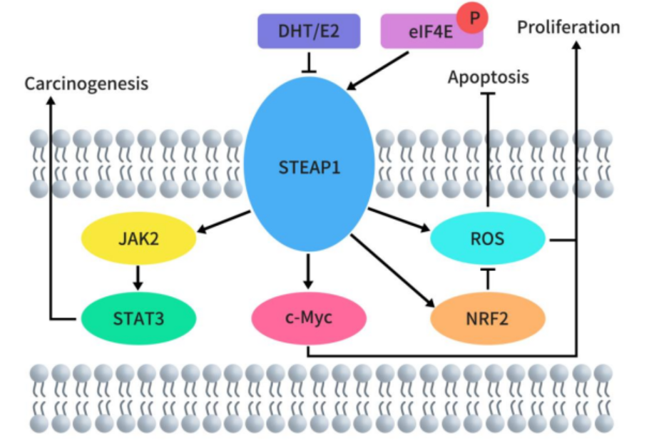 STEAP2,又被稱為前列腺六跨膜蛋白 1(STAMP1),是一種由 490 個(gè)氨基酸組成的(56.1 kDa)蛋白質(zhì),其在高爾基體復(fù)合體、跨高爾基體網(wǎng)絡(luò)以及質(zhì)膜中高度表達(dá)。這表明 STEAP2 參與了某些內(nèi)吞和外排運(yùn)輸途徑。STEAP2 有助于紅細(xì)胞中 Fe3+ 和 Cu2+ 的正常攝取,并將其還原為 Fe2+ 和 Cu+,從而促進(jìn)轉(zhuǎn)鐵蛋白循環(huán)的進(jìn)行。通過激活 ERK 通路,STEAP2 誘導(dǎo)癌細(xì)胞在 G0-G1 細(xì)胞周期階段的部分停滯,從而增加細(xì)胞增殖和腫瘤發(fā)展。