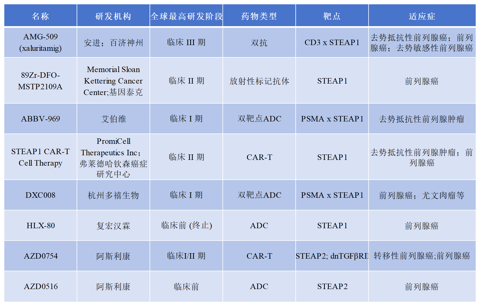 關(guān)于STEAP1/2在研的部分藥物進(jìn)展如下表所示: