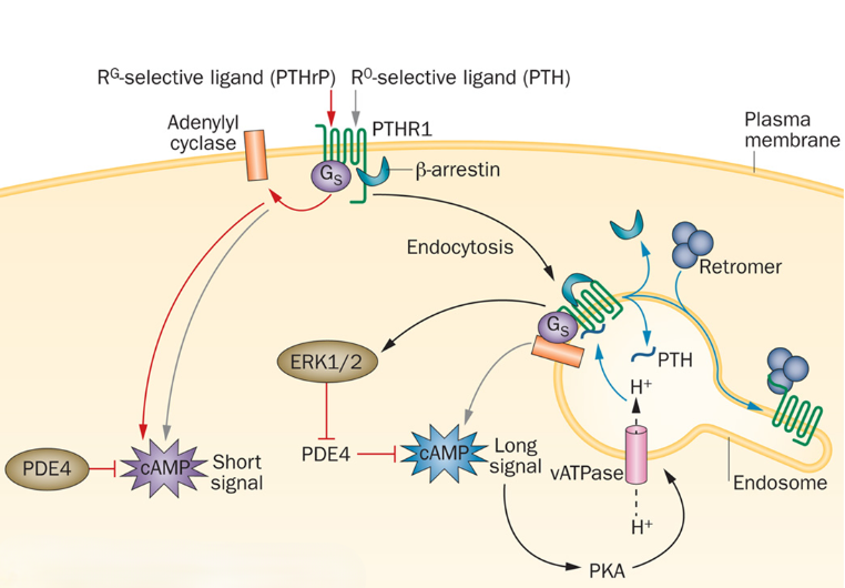 PTH1R的核心結(jié)構(gòu)包括N端胞外結(jié)構(gòu)域(ECD)、7次跨膜結(jié)構(gòu)域(7TMD,由七個跨膜α螺旋和連接環(huán)組成)和C端胞內(nèi)結(jié)構(gòu)域。PTH 或 PTHrP 的氨基末端肽與PTH1R的ECD結(jié)合后,會導(dǎo)致 G 蛋白的激活,主要是 Gα,它激活腺苷酸環(huán)化酶,并以磷酸二酯酶限制的方式催化 cAMP 的產(chǎn)生。當(dāng)達(dá)到足夠的局部細(xì)胞內(nèi)濃度時,cAMP 激活 PKA,PKA 易位到細(xì)胞核,在核內(nèi)磷酸化 CREB,從而能夠在特定基因上轉(zhuǎn)錄 cAMP 響應(yīng)元件,從而調(diào)控成骨細(xì)胞分化和鈣磷代謝。PTH1R 信號傳導(dǎo)可以發(fā)生在細(xì)胞表面,或者對于 PTH 氨基末端肽,它也可以發(fā)生在配體和受體內(nèi)化后。