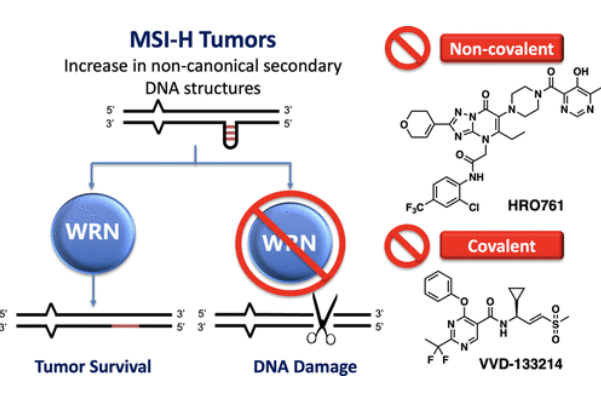 國際頂級期刊之一Nature于去年同一天上線了兩篇關于WRN(Werner綜合征RecQ解旋酶)抑制劑的文章,其中一篇是關于Novartis的HRO761的發(fā)現(xiàn)過程,另一篇介紹了拜耳(Bayer)旗下Vividion Therapeutics 公司的VVD-133214 (又叫RO7589831)的發(fā)現(xiàn)過程。這些文章重燃了醫(yī)藥行業(yè)對“WRN”這個合成致死靶點的關注。