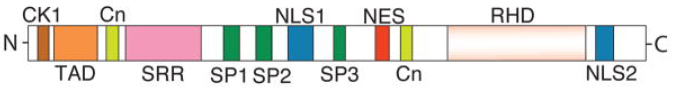 在人類中,NFAT家族由五個(gè)不同的基因產(chǎn)物組成,命名如下:NFAT1(也稱為NFATc2和NFATp);NFAT2(也稱為NFATc1和NFATc);NFAT3(也稱為NFATc4)NFAT4(也稱為NFATc3和NFATx)和NFAT5(也稱為TonEBP和OREBP)。鈣調(diào)控的經(jīng)典NFAT蛋白(NFAT 1-4)由多個(gè)功能模塊組成,這些模塊決定了蛋白質(zhì)的磷酸化、核內(nèi)定位、DNA結(jié)合以及目標(biāo)基因的轉(zhuǎn)活化。N端區(qū)域包含調(diào)控結(jié)構(gòu)域,包括酪蛋白激酶1(CK1)對(duì)接位點(diǎn)、轉(zhuǎn)活化結(jié)構(gòu)域(TAD)和鈣煜氨酸(Cn)對(duì)接位點(diǎn)。C端包含DNA結(jié)合的Rel同源結(jié)構(gòu)域(RHD)和一個(gè)額外的鈣化神經(jīng)素對(duì)接位點(diǎn)。蛋白質(zhì)中間有幾個(gè)富含絲氨酸的結(jié)構(gòu)域(SRR、SP1-3),為靶向NFAT的激酶提供磷酸化位點(diǎn)。此外,NFAT蛋白包含兩個(gè)調(diào)控其亞細(xì)胞定位的信號(hào)序列:核定位信號(hào)序列(NLS1和NLS2)和核輸出信號(hào)(NES)。與經(jīng)典的NFATc蛋白不同,NFAT5(也稱為強(qiáng)張?jiān)鰪?qiáng)蛋白結(jié)合蛋白)不依賴鈣神經(jīng)素或核伴侶即可發(fā)揮活性。