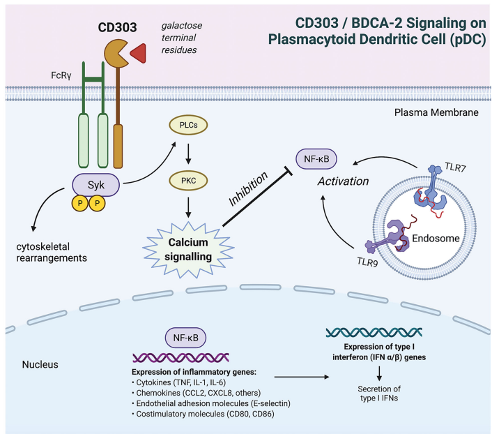 BDCA-2 (blood DC antigen 2血液樹突狀細(xì)胞抗原2)又叫CLEC4C或CD303,是人類pDCs特有的II型c型凝集素受體(CLR),與TLR-7/9協(xié)同識別微生物和協(xié)調(diào)炎癥免疫反應(yīng)。BDCA-2是一種可溶性跨膜糖蛋白,由聚集在12號染色體上的c型凝集素編碼基因編碼,包括KLRG1和CLEC4A。與其他CLR類似,BDCA-2具有單個(gè)胞外碳水化合物識別結(jié)構(gòu)域,并且在其短細(xì)胞質(zhì)尾部缺乏固有的信號基序。BDCA-2選擇性地與IgG分子上的半乳糖端聚糖結(jié)合,產(chǎn)生抗炎反應(yīng)來抵抗因?yàn)橥ㄟ^抗原吸收、內(nèi)化、呈遞給T細(xì)胞以及信號通路如IFN-I,NF-kB等其他炎性體激活。BDCA-2與跨膜區(qū)的FcRγ鏈形成adaptor,允許酪氨酸激酶募集磷酸化以及鈣動員,類似于b細(xì)胞受體(BCR)信號體,BDCA-2信號通過免疫受體酪氨酸激活發(fā)生基序(ITAM)介導(dǎo)的酪氨酸(Syk)磷酸化,磷脂酰肌醇特異性磷酯酶(PLCγ2),PKC的激活等誘導(dǎo)鈣流入并在pDC中充當(dāng)負(fù)調(diào)節(jié)劑,介導(dǎo)IFN-Ⅰ抑制并通過BDCA2觸發(fā)減少NFKB的激活。