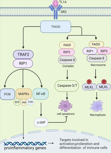 在靜息的T細(xì)胞中,DR3以可溶性形式表達(dá),保護(hù)細(xì)胞免于凋亡。活化的T細(xì)胞表達(dá)跨膜DR3。sTL1A結(jié)合DR3 (膜結(jié)合形式)激活下游信號(hào)級(jí)聯(lián),從而調(diào)節(jié)免疫反應(yīng)和炎癥。sTL1A/DR3相互作用可觸發(fā)兩種不同的信號(hào)通路,分別引起炎癥和細(xì)胞凋亡。首先,DR3的死亡結(jié)構(gòu)域與細(xì)胞質(zhì)中的適配蛋白TNFR相關(guān)死亡結(jié)構(gòu)域蛋白(TRADD)結(jié)合,然后招募TNFR相關(guān)因子2 (TRAF2)和受體相互作用蛋白1 (RIP1)。這些復(fù)合物激活MAPKs (ERK、p38和JNK)、NF-κB和效應(yīng)激酶PI3K信號(hào)傳導(dǎo)。最后,激活的信號(hào)傳導(dǎo)調(diào)節(jié)促炎基因的表達(dá),參與免疫相關(guān)疾病的發(fā)生。TRADD結(jié)合FAS相關(guān)死亡結(jié)構(gòu)域(FADD)和RIP3,激活半胱氨酸天冬氨酸特異性蛋白酶-8 (caspase-8)形成復(fù)合物,進(jìn)一步激活下游caspase通路(如caspase-3和-7),誘導(dǎo)凋亡細(xì)胞死亡。當(dāng)caspase-8活性被阻斷時(shí),F(xiàn)ADD、RIP3、RIP1與下游效應(yīng)分子混合譜系激酶結(jié)構(gòu)域樣蛋白(mixed lineage kinase domain-like protein, MLKL)在磷酸化后形成胞質(zhì)“壞死體”復(fù)合體。然后,MLKL寡聚到細(xì)胞膜上,導(dǎo)致壞死性細(xì)胞死亡,這是一種伴有強(qiáng)烈炎癥的細(xì)胞死亡形式。在這個(gè)過(guò)程中,NF-κB被證明可以誘導(dǎo)細(xì)胞凋亡抑制蛋白(c-IAP)的激活,從而介導(dǎo)細(xì)胞凋亡的負(fù)反饋調(diào)節(jié)和抑制。事實(shí)上,更多的證據(jù)表明,sTL1A與DR3的連接優(yōu)先誘導(dǎo)淋巴細(xì)胞的促炎途徑而不是凋亡。